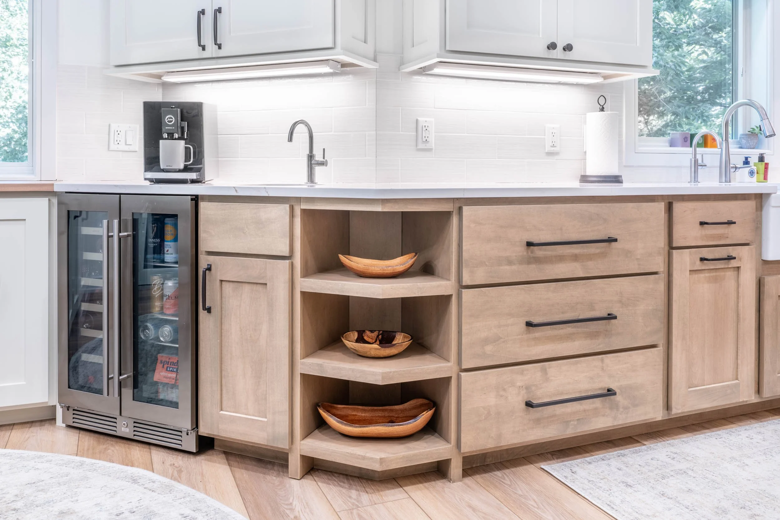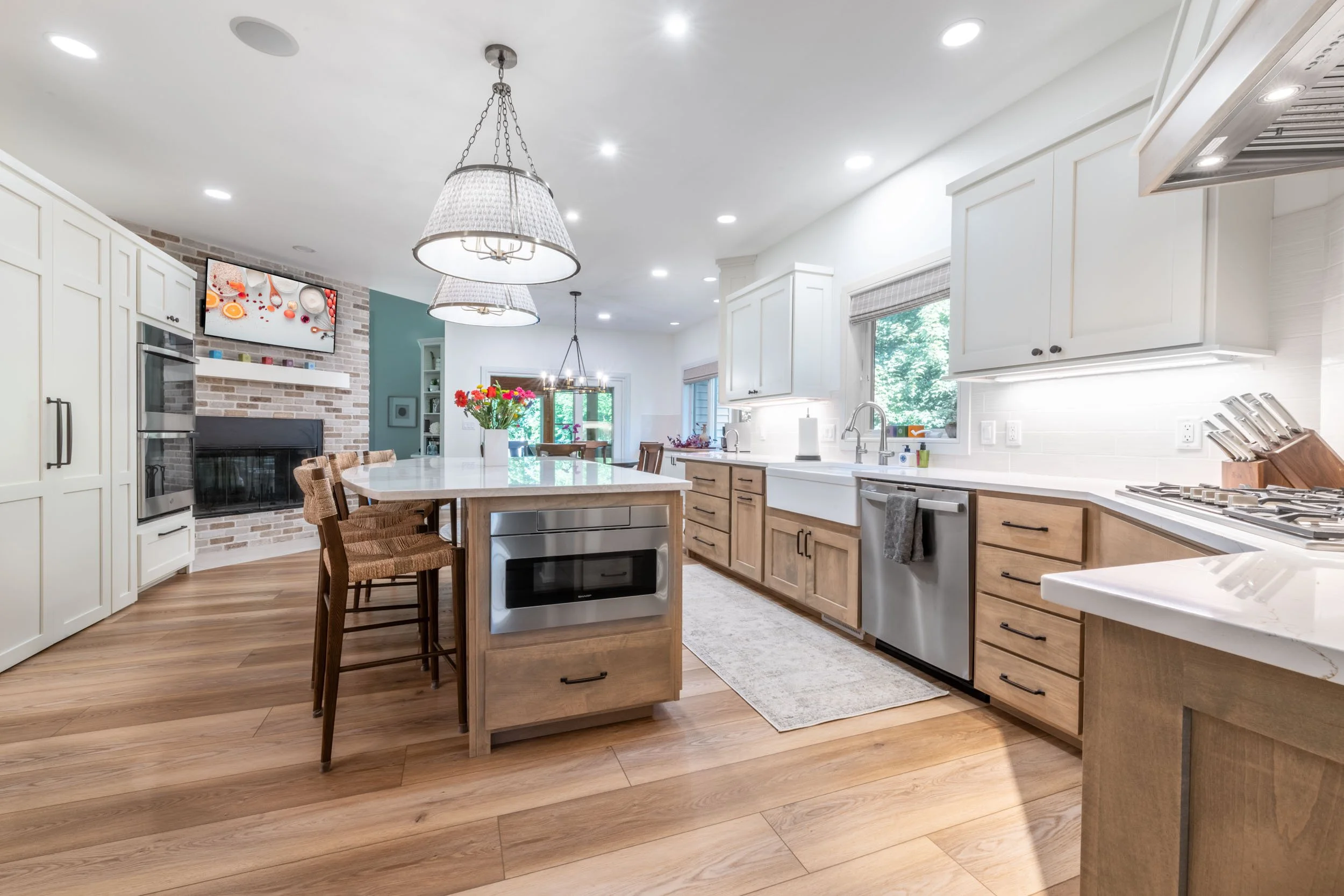 The kitchen was the heart of their home and the home remodel. Courtney and Dan wanted a brighter, more inviting space featuring better lighting, a double oven, a step-in pantry, a dedicated coffee bar, and an extended countertop space under a large window. The existing kitchen had black granite countertops, dark cherry cabinets, and maple floors. It felt heavy and a little dated. We removed all the original finishes. We installed light oak LVP flooring, which immediately opened the space. Next, we replaced the cabinetry with custom Amish-built cabinetry and Silestone countertops around the perimeter, and Cambria for the island. The angled wall near the informal dining area allowed us to create a coffee bar with a small bar sink and space for coffee pots.
