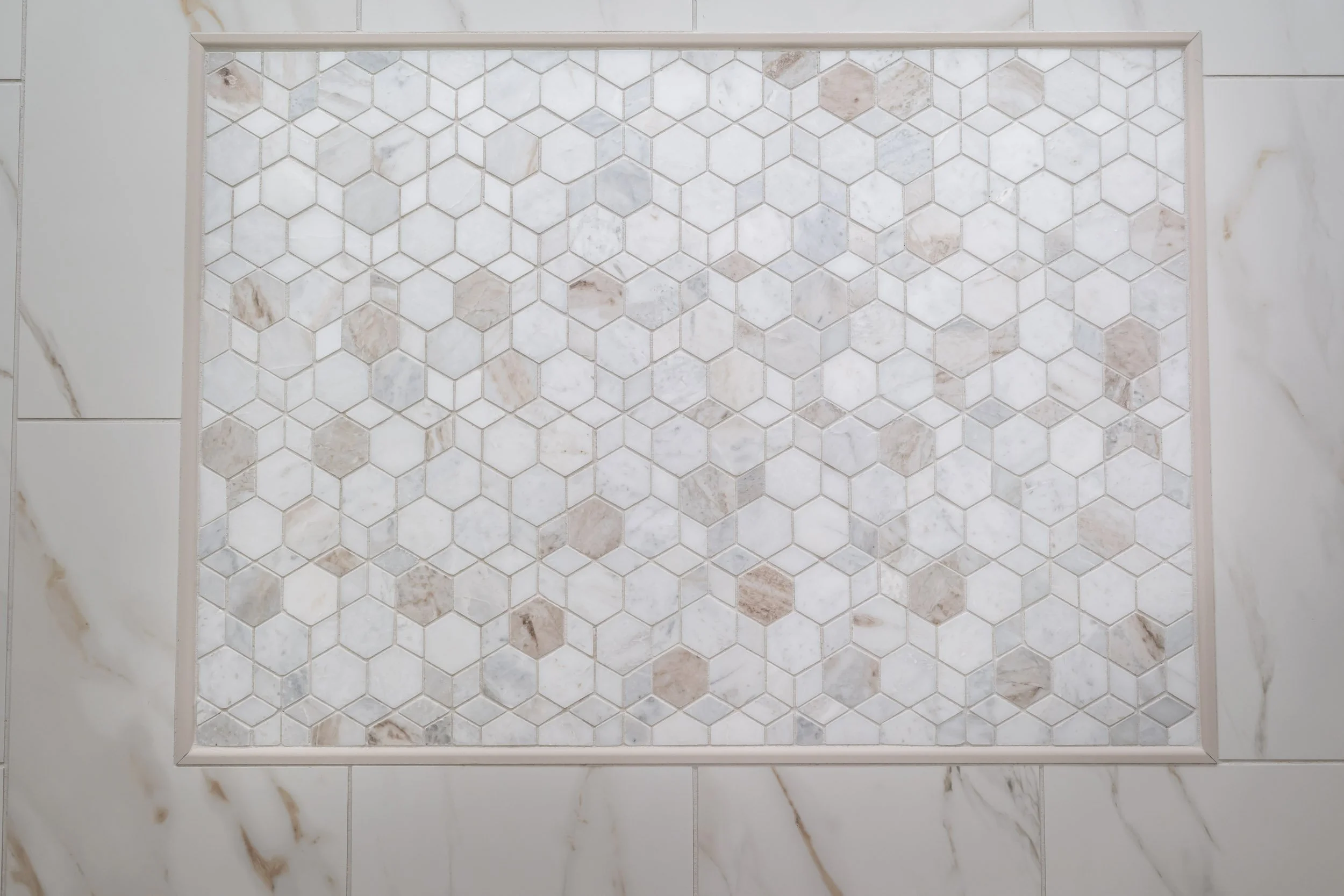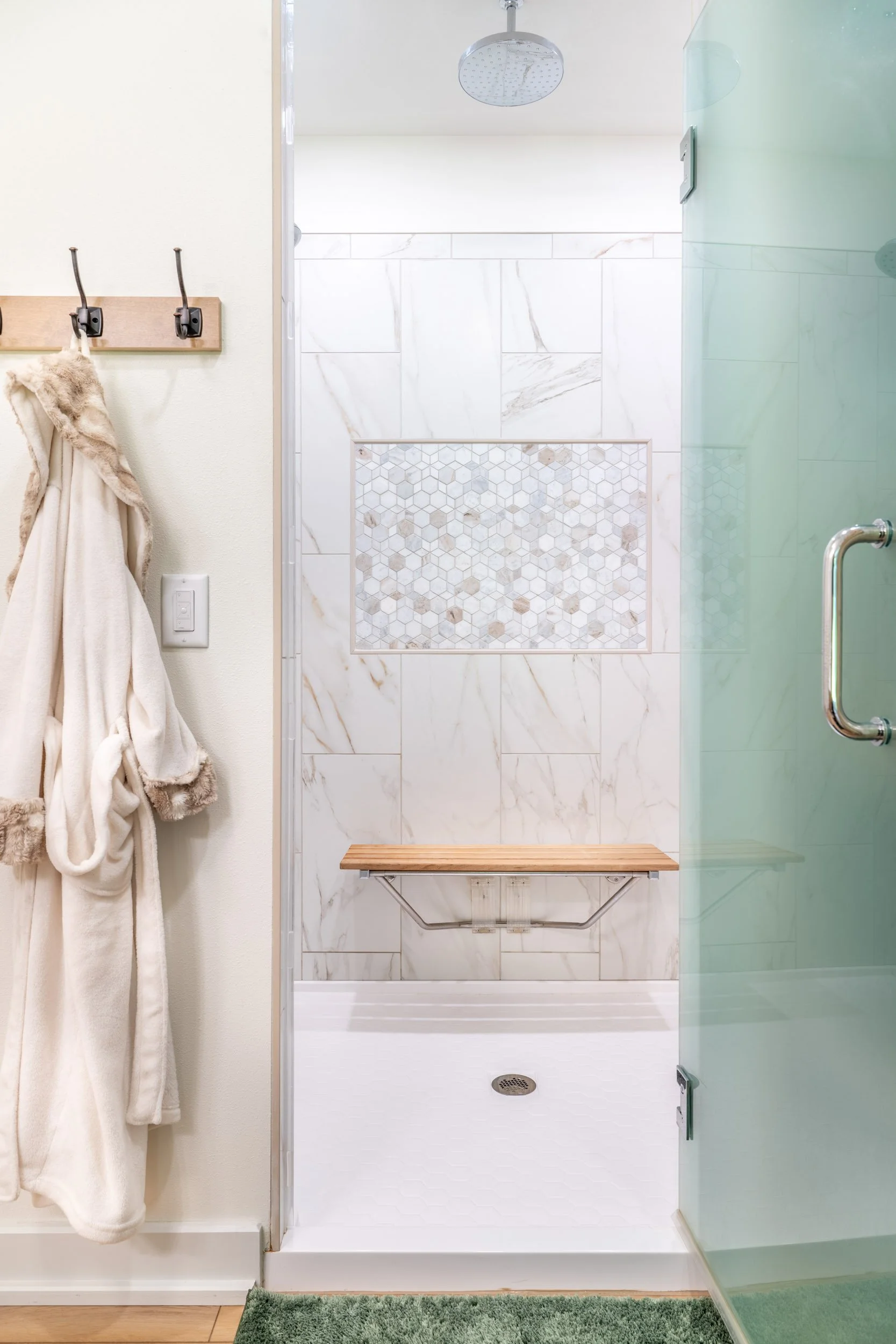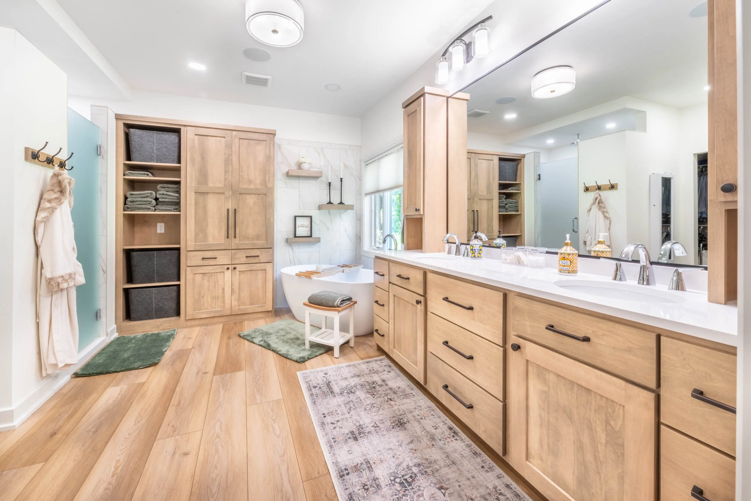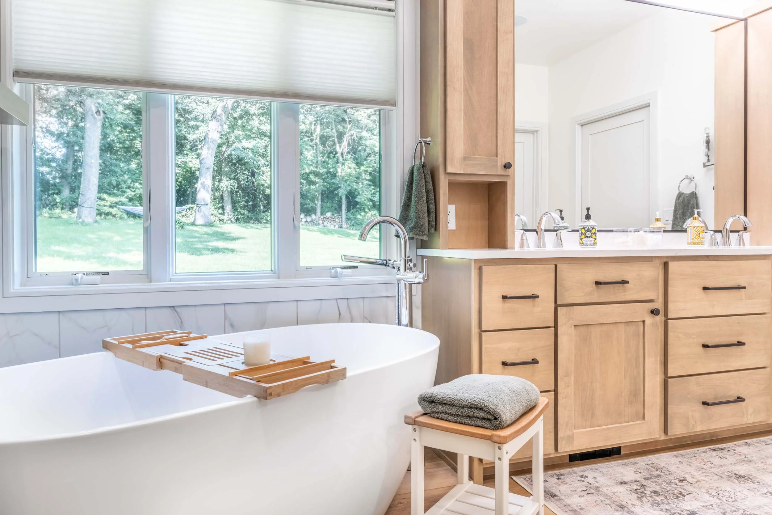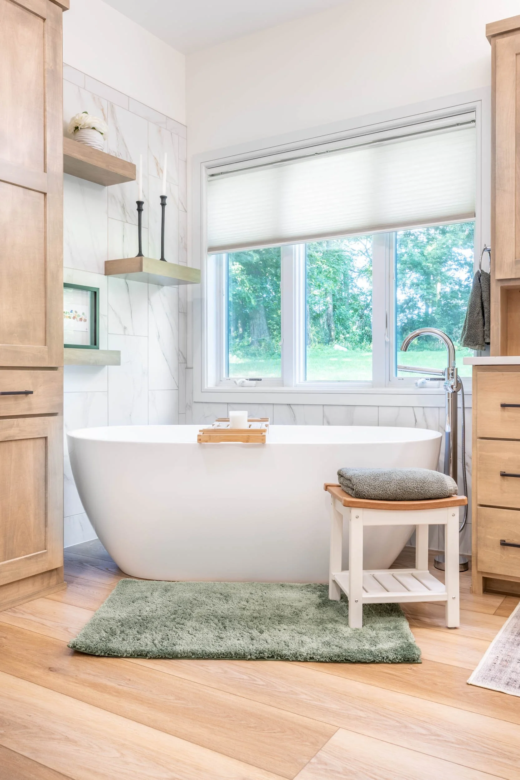 Moving through the back hallway, we come to the primary suite. Courtney and Dan wanted us to give them a spa-like retreat in their master suite. The couple envisioned a brighter, more functional space with more countertop space, streamlined storage, and a modern look. We began by removing the existing fixtures and reimagining the layout, while keeping the shower in its place. We gave the shower a complete makeover, including new tile, fixtures, and built-in shelving. To create a better entry solution, we reduced the size of the doorway, centered it on the wall, and installed a single pocket door. We replaced the original oversized jacuzzi tub with a sleek soaking tub with a floor-mounted filler. While the bathroom’s footprint largely remained the same, the new finishes, fixtures, and cabinetry completely transformed the space.