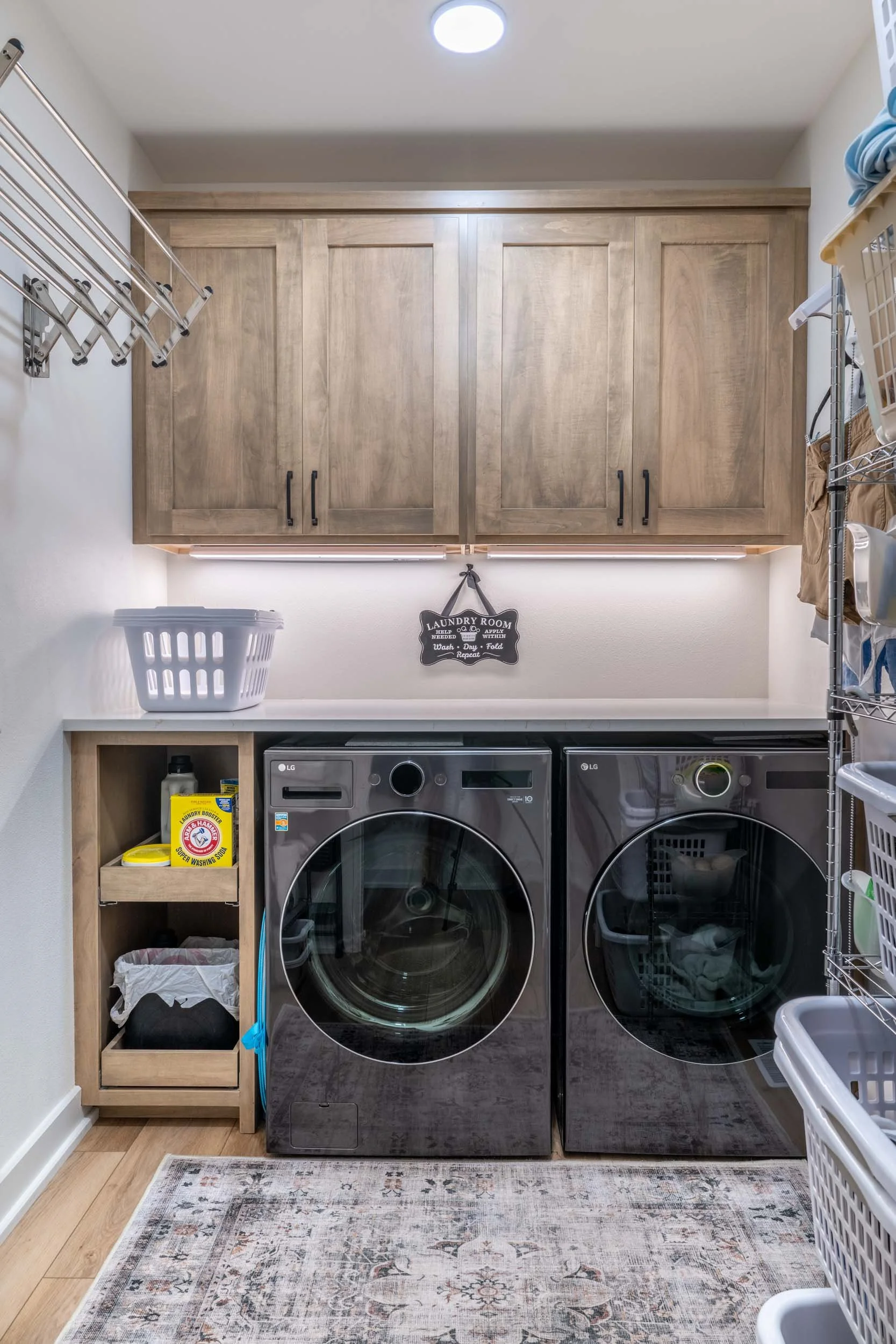 At the far end of the kitchen sat the former three-season room. Dan and Courtney imagined a space that would coordinate with the rest of their remodel and could be used year-round. We began by removing the old flooring and putting in new insulation and flooring. Window upgrades followed, along with the addition of a multi-glide door and a gas fireplace. The journey through the house brings us to the mudroom, now tailored for function and designed to meet the family’s everyday needs. Custom cubbies give every family member their own space. Bench seating, paired with storage space below for shoes and boots, maximizes convenience. For a cohesive look, we continued the same cabinetry color from the kitchen into the mudroom. The laundry room also received an upgrade; organizational shelving, cabinetry, and storage now accommodate multiple laundry baskets. New cabinetry and fixtures offer improved functionality and enhanced visual appeal.