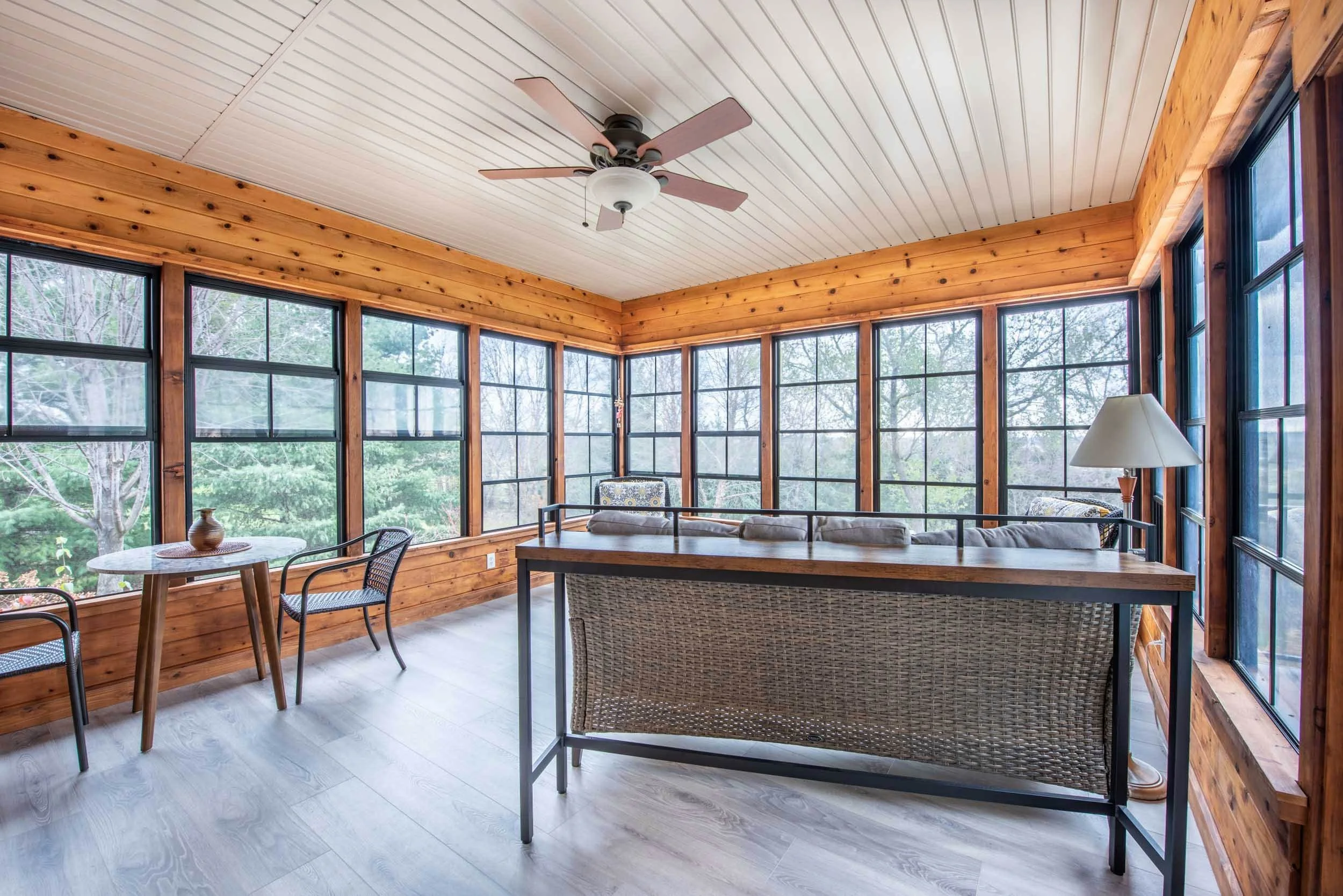We began the sunroom remodel once the improved patio door was installed and connected the space to the main home. We removed the hard-to-open aluminum storm windows, enlarged the openings slightly, and installed Porch Conversions Three-Season Windows. The new windows give the space a new vibe! The sunroom is no longer a catch-all storage space. It has been transformed into a focal point for the kitchen, providing a connection to the home that invites you to sit, relax, and enjoy the view of the yard or keep tabs on the teenagers in the pool below.