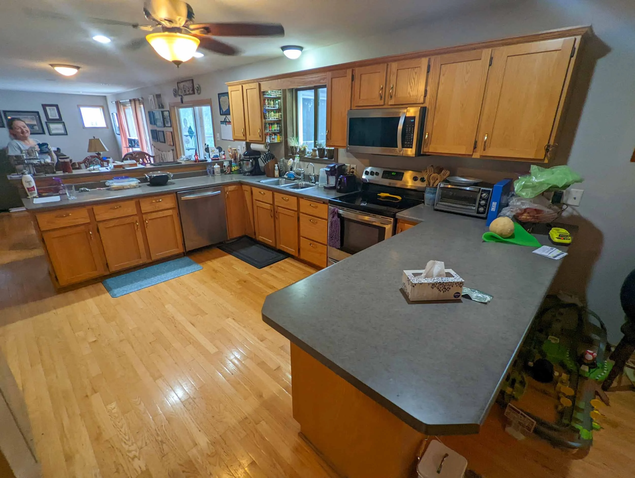 Brian and Sarah are parents of middle school-aged kids and active community members. We recently completed a kitchen renovation for their lovely transitional home in the Sunnybrook neighborhood in DeForest, WI. They had been living with their existing kitchen for a while and were ready for a change. The existing kitchen was open to the rest of the home but felt closed off and awkward. They desired a kitchen transformation that fit their lifestyle, from everyday cooking to family get-togethers. Sarah is an avid baker and wanted a wall over to meet her baking needs.
