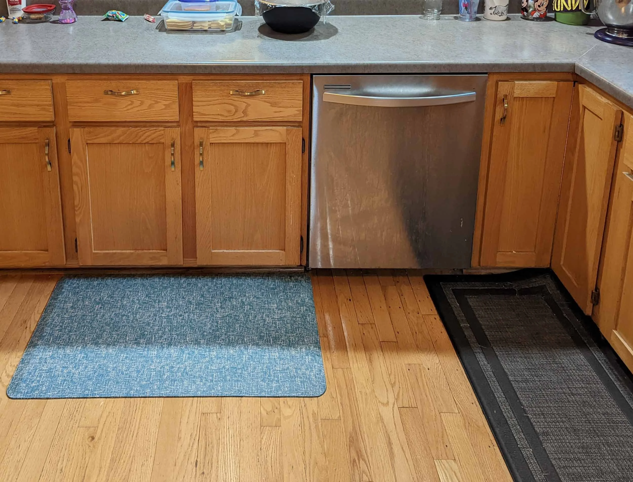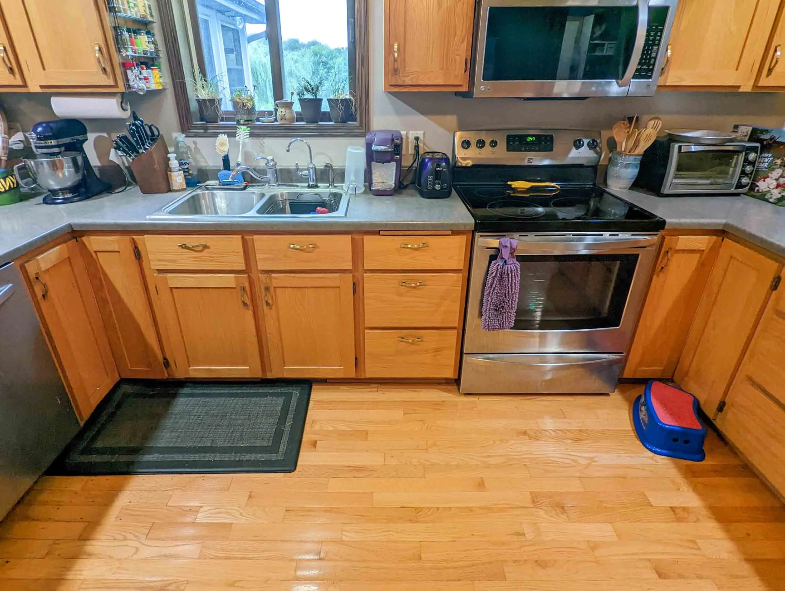 However, in reality, the kitchen was only semi-open and awkward. Both ends of the kitchen had a peninsula that stretched ¾ of the way across the room. This created a visual barrier when sitting in either of the flanking rooms. Add dark orange oak cabinets, flooring, and trim, and the kitchen felt like a dark, unappealing corner.