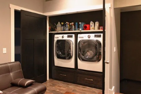 If you have no dedicated space but still want a laundry room, one alternative is to tuck the laundry away in an existing room. Laundry rooms and kitchens share much of the same needs, so hidden laundry rooms are often found off of the kitchen. Bathrooms also have water supply and drainage, so they are also a common room used for a hidden laundry.