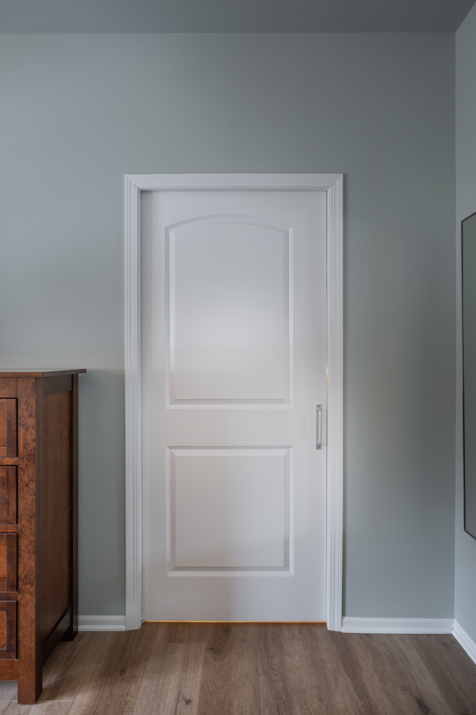 The existing master bathroom was serviceable and featured luxury features, such as a full-tile shower with touchpad controls. However, some fundamental design flaws made the bathroom feel small and cramped. The original bathroom was split into two spaces, the vanity room and the water closet, with the toilet and shower. The existing vanity room was cramped and had three doors that swung into the room: the closet door, bedroom door, and water closet door.