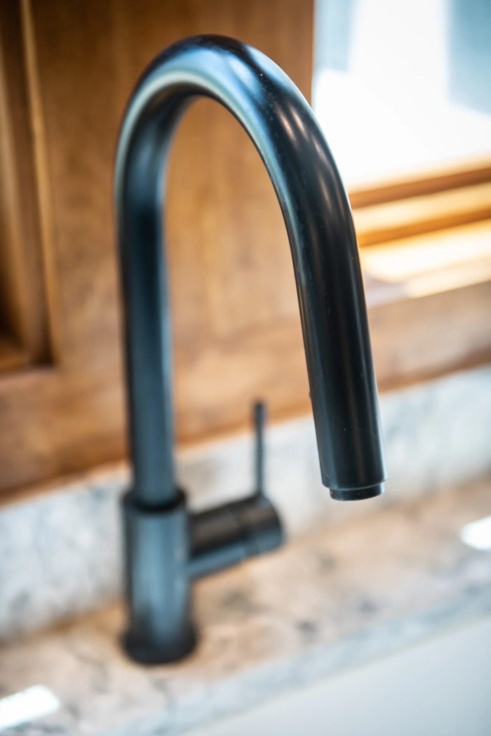 In keeping with the functionality that our clients requested, we included a new appliance suite by LG featuring a French door refrigerator, An LG gas range, and an LG dishwasher. We added a focal point, stainless steel Zephy range hood, and completed the appliances with a Sharp Micro-Drawer. For filling large pots at the stove, we included a matte-black Signature Hardware wall-mounted pot filler over the stove.